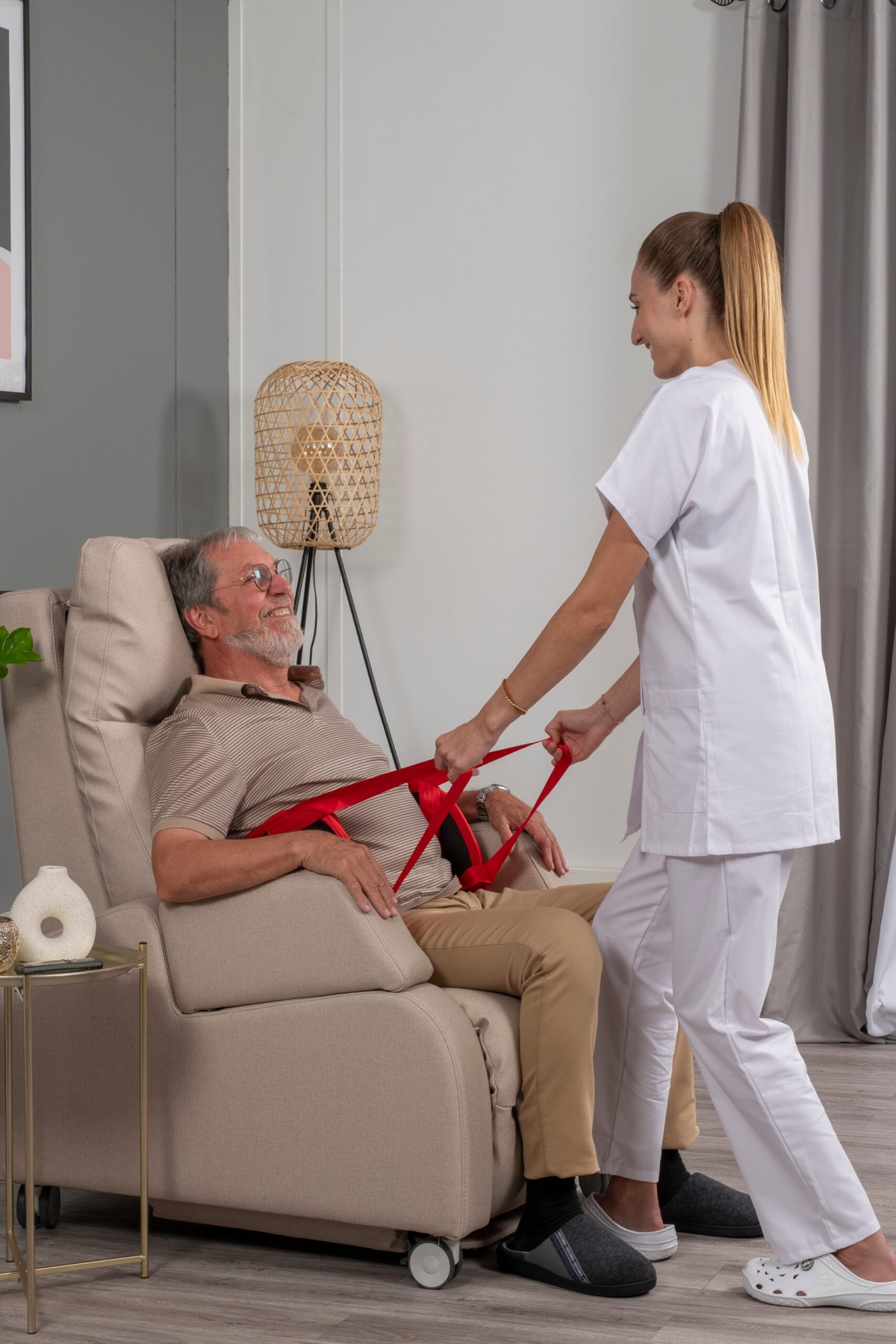 The Transfer Belt is used to lift a seated person and protects the caregiver from poor posture during manual transfers, thereby reducing back pain and musculoskeletal disorders.