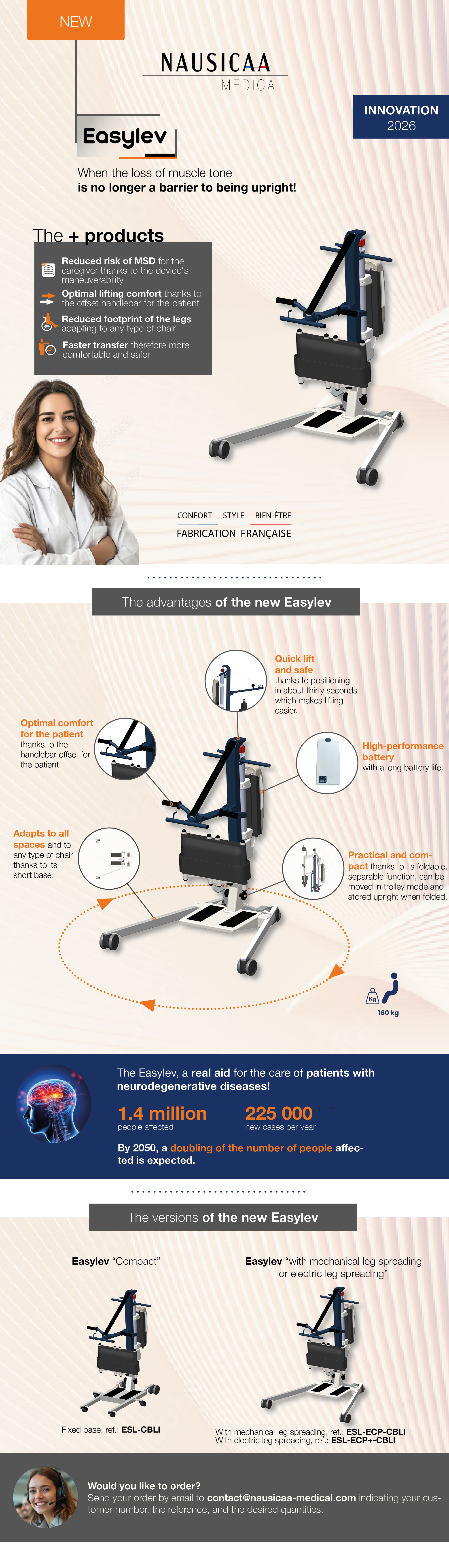 Nausicaa Médical has developed the new Easylev stand-up lift to meet all needs related to reduced patient muscle tone, particularly those associated with progressive neurological disorders. Designed to bring the most fragile patients to a standing position without avoidable pain, the Easylev is based on a respectful, gradual lifting pattern. Its rapid weight-bearing improves tolerance in patients with pain and neurodegenerative conditions, while securing the caregiver’s handling technique. Optimal comfort during lifting thanks to its offset handlebar system for the patient