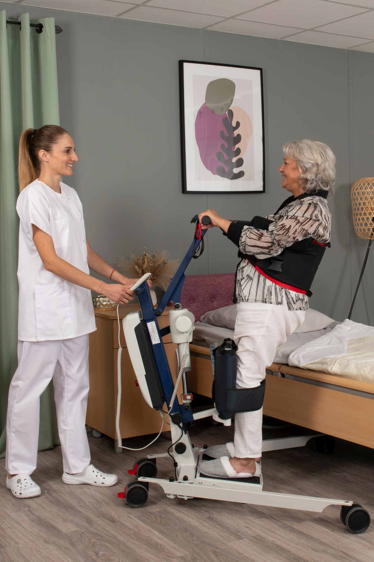 The Way Up’Go is the only stand-up lift on the market offering powered drive assistance. Its electric motorization reduces handling time and therefore patient stress, improving comfort during transfers.