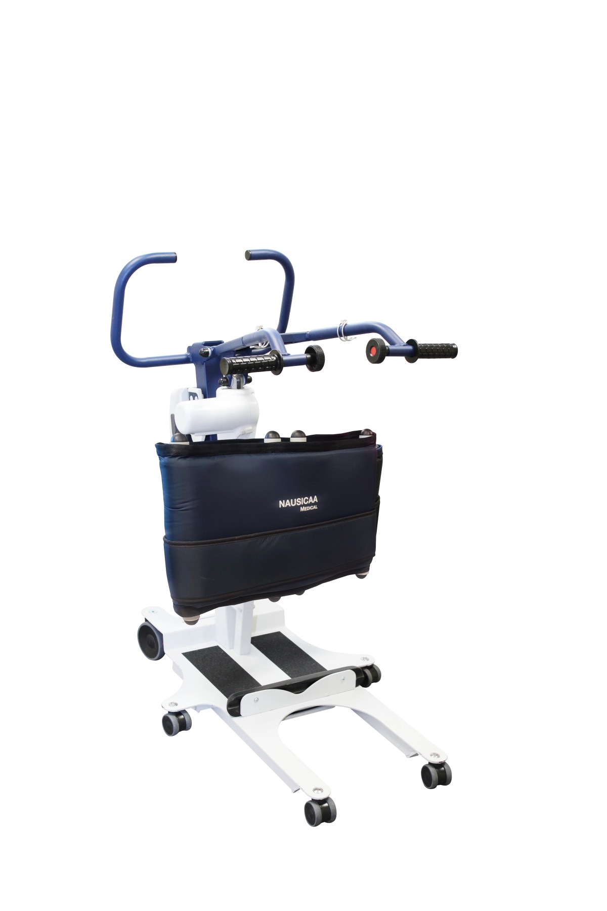 An adjustable lift arm that adapts to the patient's morphology for more effective standing with 3 different lengths, plus specific asymmetrical positioning (for hemiplegic patients, for example). The lifting arm is also reversible to respect the patient's posture, with 4 possible settings: up, down, crossed (internal or external handles). A new fastening system: the strap is attached from the inside of the device, making it easier to fasten. An ergonomic knee support that's faster, simpler and more comfortable: - No positioning or adjustment constraints - Designed to reduce the pressure exerted during lifting - Legs can be locked in place with the calf support strap Maximum patient weight: improved capacity to handle patients up to 180 kg (compared with 150 kg on previous models)