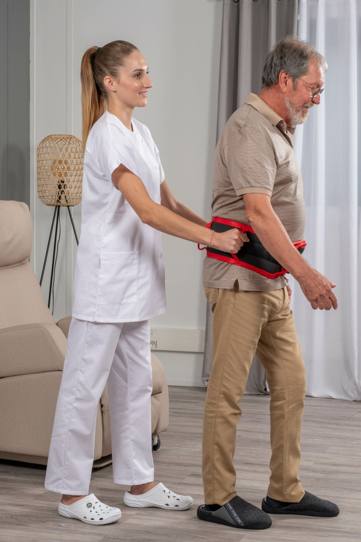 En tant qu’aide à la marche, cette ceinture s’utilise sur le patient comme un accompagnement.