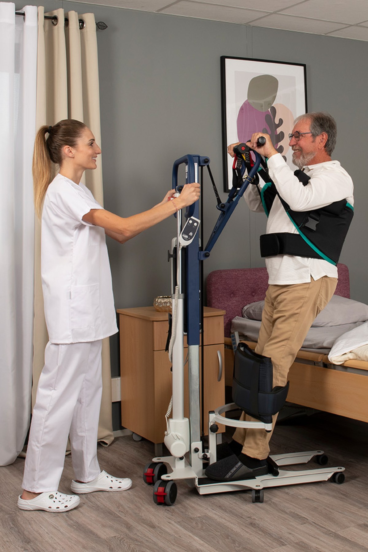 Caractérisé par son double mouvement breveté, le nouveau EASYLEV 5 est un verticalisateur haut de gamme permettant aux soignants de fournir des soins de haute qualité dans tous types d'environnements.