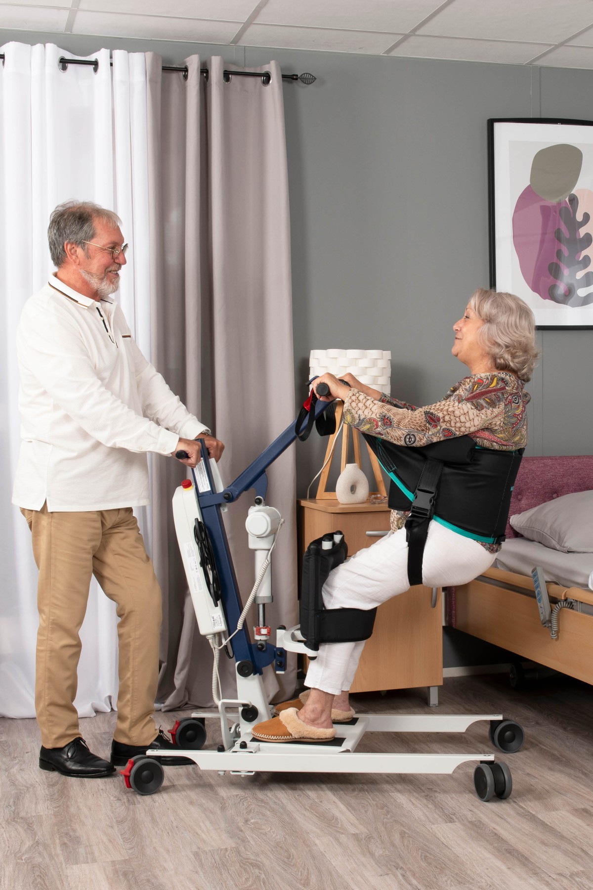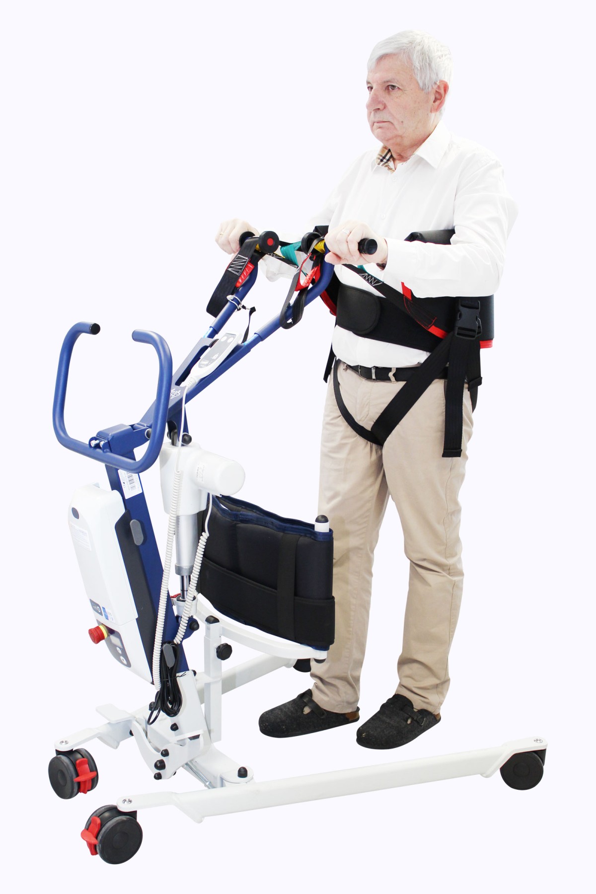 Le déploiement partiel du bras de relevage combiné à la sangle sous-fessière donne une position assise.